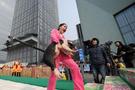 长沙举行冰面抱花猪赛跑 美女抱猪亲吻获年货