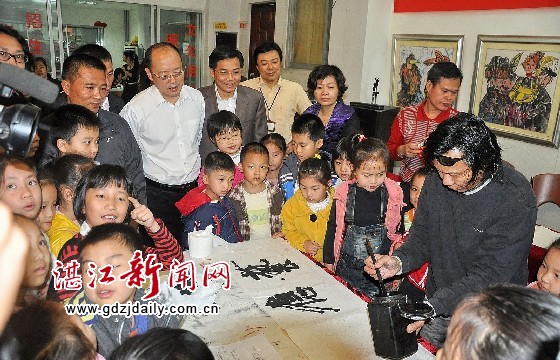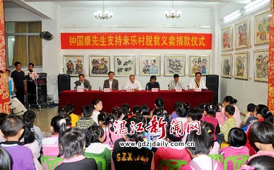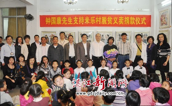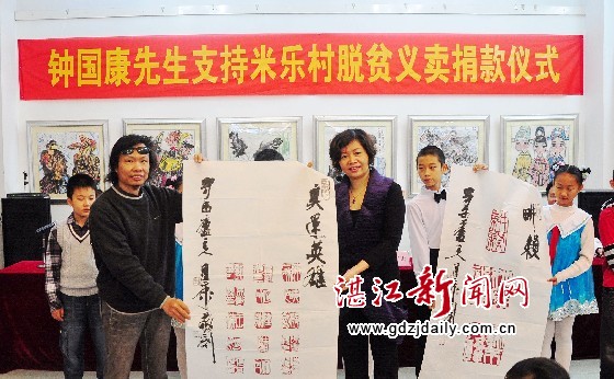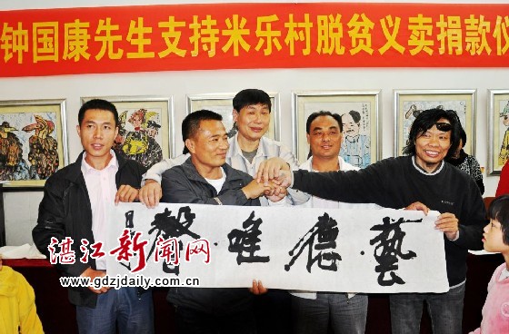 湛江新闻网讯: 11日,冬季的湛江温暖如春,分外温馨。著名篆刻书法家“最丑的那个人”钟国康回到家乡湛江,参加由市文广新局举办的为米乐村脱贫义卖捐款活动,用艺术回馈社会,为贫困乡亲奉献爱心。副市长梁志鹏,市文广新局局长李更盛等领导和市慈善会代表,市艺术培训中心师生,吴川市王村港镇委、镇政府和米乐村代表等参加了活动。