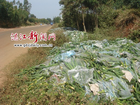 湛江新闻网讯:青瓜价格犹如过山车。今年10月初,徐闻青瓜刚上市时,价格每公斤超过2块钱。但最近一个月当地青瓜的价格一直处于低迷状态,最低价每公斤不到2毛钱。由于价格低贱加上滞销,记者14日下乡采访发现瓜农把大量无法卖出去的青瓜倾倒在园头、或公路边。目睹此情此景让人心酸不已。