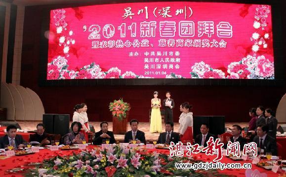 吴川市市长江毅在会上向在深圳创业、发展的乡亲致以新春的问候和良好的祝愿,对他们长期以来关心支持家乡建设和发展表示衷心感谢,他通报了今年全市经济社会发展情况。今年来,吴川市以打造湛茂经济发展圈战略高地为目标,着力转变经济发展方式,调整产业结构,积极开展招商引资,全力以赴推进一批项目建设,努力保障和改善民生。特别是新一任领导班子团结拼搏,创新思路,锐意开拓,扎实苦干,依靠全市人民的共同努力,经济发展和社会各项事业取得了新的成效。县域经济实力逐步增强,预计全年实现生产总值103.3亿元,增长12.8%;工业总产值138.2亿元,增长18.6%;全社会固定资产投资50亿元,增长46.5%;社会消费品零售总额58.1亿元,增长19.5%;地方财政一般预算收入3.4亿元,增长23%。他希望在外乡亲一如既往热心支持家乡的经济建设和社会事业发展,积极主动地回到家乡捐资兴办公益事业和投资创业,积极推进“回归工程”。