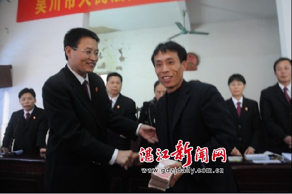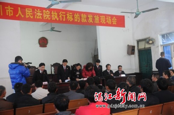 1月28日下午,吴川市人民法院举行执行标的款发放现场会,将1769955.4元工资款以现金或支票的形式,发放到黄瑞章等36位农民工代表手中,有效防止了一起可能引发的群体性暴力事件,确保了社会和谐稳定。