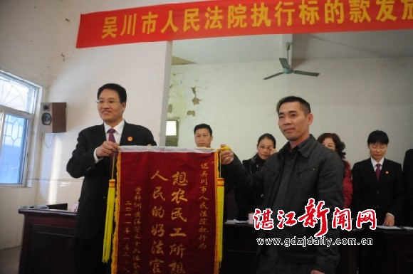 “这170余万元,我们苦苦追讨了三年都拿不到,没想到吴川法院为我们挺身而出,仅用50天的时间就执结了,给我们讨回了工资,这下可高兴回家过年了!”领取工资时,黄瑞章特意给吴川法院送上一面“想农民工所想 人民的好法官”锦旗。