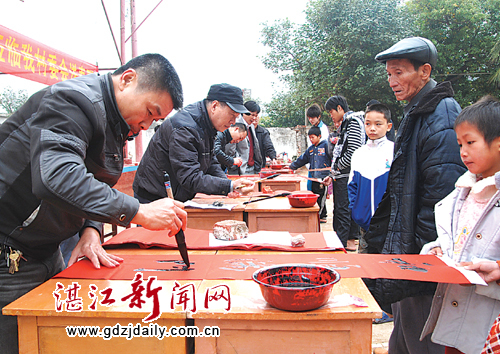 春节前夕,徐闻县委宣传部开展送春联下乡活动,组织该县书法界人士10多人到锦和镇六极村、龙塘镇赤湖村等村庄为村民撰写春联。这些春联有的歌颂新农村建设的变化,有的赞美农民的幸福生活,寄托农民的美好愿望。活动首日,600多副春联被村民争抢一空。