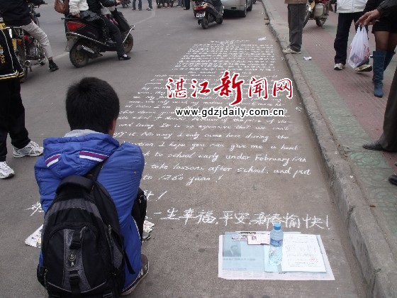 湛江新闻网讯:正逢新春佳节,吴川市区内人流如潮。日前,记者在解放路一中操场路段见到一名身穿蓝色外套和一件黑色运动裤的学生模样的男子蹲在地上,面前摆放了一张高中毕业会考证和一份家庭情况调查表,地上分别用汉语和英语写上乞讨信,吸引了不少市民驻足观看,并纷纷掏钱送上一份“爱心”。