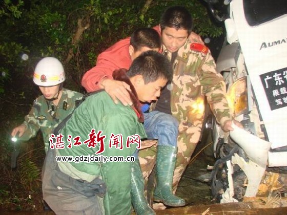 17日凌晨4时47分,一阵急促的电铃声将官兵们从睡梦中惊醒,110指挥调度中心传来警情:称位于吴川境内325国道黄坡大桥路段一辆货车侧翻至路基下沟渠里,有一名人员被困,急需救援。吴川消防中队迅速出动两台消防车、8名指战员赶赴现场。此时,货车的车头部分已经侧翻到路基下面的沟渠里,车厢尾部悬挂在路基上,整个车身侧面呈悬空状态。车头与路旁大树剧烈撞击而扭曲变形,位于副驾驶室的被困人员双脚被凹进的车头死死卡住,见此场景,中队指挥员迅速组织在场的人员对车身进行固定,防止车辆进一步侧翻造成二次伤害。