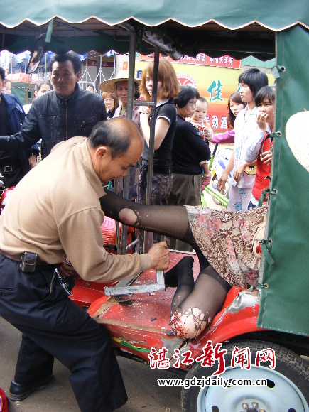 据目击者称,二轮摩托车的车速很快,越道猛烈撞向上三轮摩托车左侧后,二摩上的一对男女青年相继重重弹出俯倒车轮和地面上。由于冲力过大,三轮女司机也被弹倒地上,幸亏戴着安全头盔伤势甚小,而坐在车内的女青年,还未等她反应过来,已撞上护栏血染车内。事故发生后,现场群众报了警和120救护中心,并协助医务人员抬救伤者进救护车内急送医院。