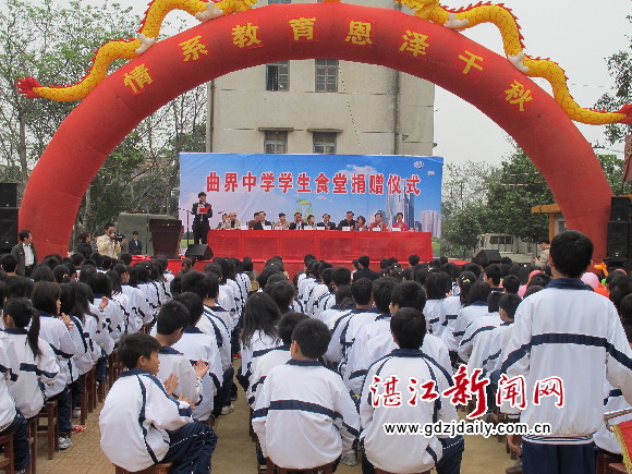 湛江新闻网讯:“这是从深圳来的热心人,让我们用掌声欢迎他们。”3月3日,曲界中学校园内彩旗飘舞,掌声不断,号声嘹亮,仪仗队奏起欢迎曲,深圳市政协副主席张效民、陈思平带领深圳市统战部、慈善会、同致行地产顾问有限公司等领导干部,参加曲界中学学生食堂捐赠仪式,帮助解决该校1350名学生就餐问题。