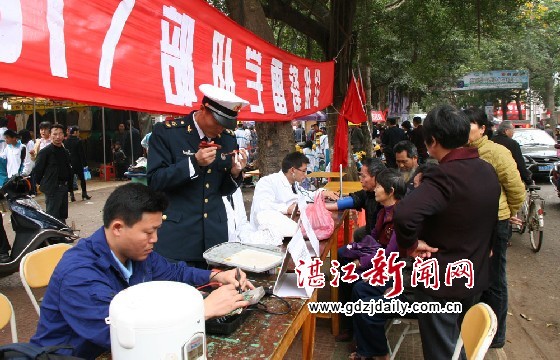 徐闻街头学雷锋氛围特浓,到处都有学雷锋便民服务活动点。笔者在东方一路看到来自徐闻团县委组织的“学雷锋一条街”活动,有来自该县消防大队、大井部队、徐闻中学、徐闻一中、徐闻二中、职业中学、城南中学、徐闻县人民医院、徐闻县第二人民医院、徐闻中医院等600多名团员青年志愿者上街开展义诊、心理疏导、维修电器、刷皮鞋、理发等志愿服务,还有发放宣传资料,宣传消防知识等,受到市民的欢迎。