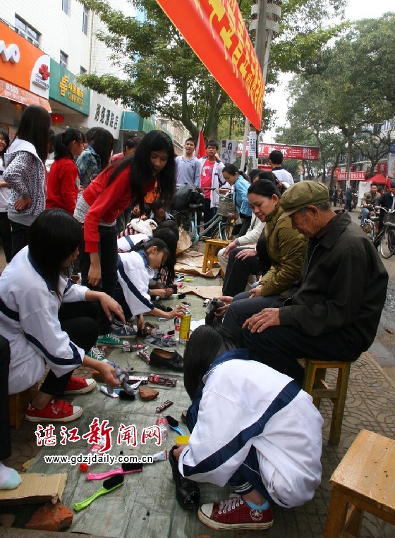 团员志愿者上街刷皮鞋学雷锋。徐大荣摄
