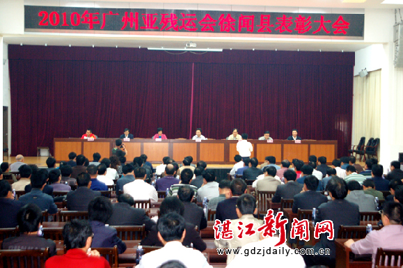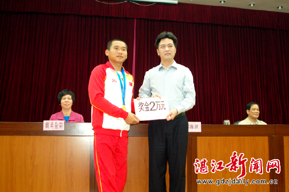 湛江新闻网讯:3月15日上午,2010年广州亚残运会徐闻县表彰大会在县政府会务会中心举行。会上,徐闻县体育史上第一个亚残运会冠军谭亚腾回乡接受了表彰奖励,县长林海武代表县政府向他颁发了2万元的奖金。