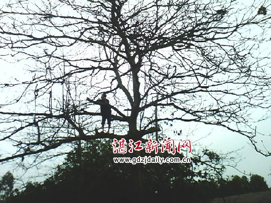 湛江新闻网讯:3月24日傍晚时候笔者经过徐闻县和安镇外村村时看到一个40多岁的中年男人站立在一棵枇杷树上,他双脚踩在一条约有成人的大腿的树枝上,他右手按在另一条有成人的手臂那么大的树枝上,他左手握着手机正眉飞色舞地说话、、、他离地面的位置本人目测了一下大约7米。一旦摔下来非死即伤的!笔者认为此举不可取的!