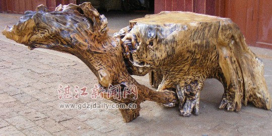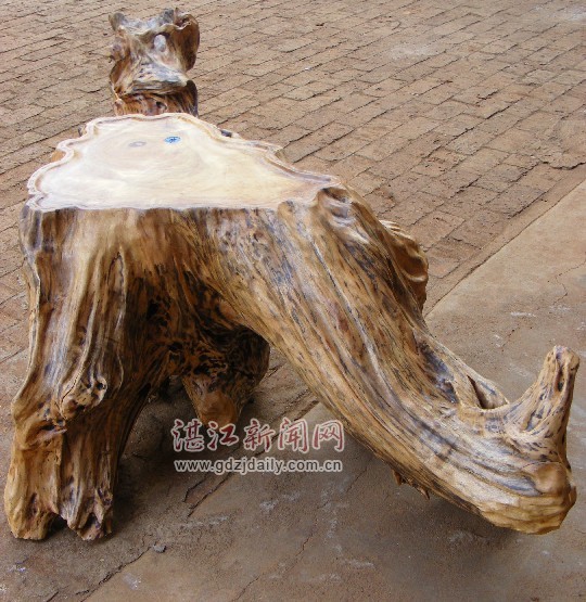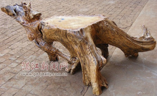 湛江新闻网讯:近日,一位姓黄的根艺爱好者在徐闻县下桥镇石板西村前园地里意外发掘了一棵樟木树头,该树头长2.1米,高60厘米,重约300多市斤。根据有经验的根艺爱好者鉴定,整棵树头形状酷似一只正在奔跑的凶猛“恐龙”,前脚细小,后腿肥大,身上有着天然而美丽的花纹。