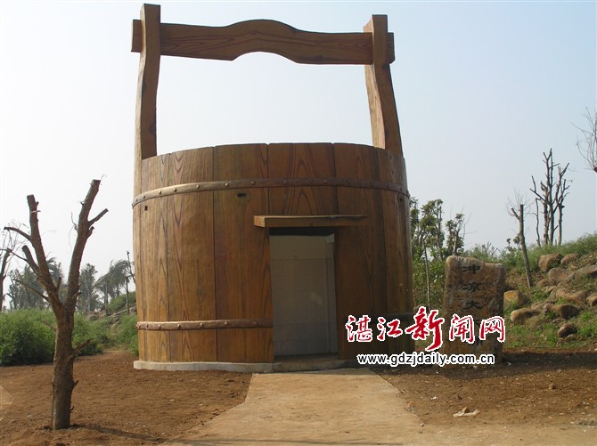 湛江新闻网讯:在徐闻县龙泉森林公园内,有着一个巨无霸的“木桶”。该建筑是龙泉森林公园景区以雷州半岛乡村“木桶”为造型,用钢筋混凝土建筑起来的一个公共浴室。它高7米,直径4.3米,可供4个游客同时洗澡、淋浴,带给游客们的是一份愉悦的心情!