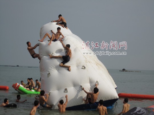白沙湾,位于徐闻县城东南,由排尾角和红坎角两角环抱,犹如抱着一弯新月,故得雅号“双角揽胜”。这里有着3000多米长的银白色的沙滩,有着蔚蓝清澈的海水,这里的海面风平浪静,在这里游水既能浏览波光海色、又能眺望对岸的海口市的高楼踪影,为了让游客们玩得更加舒心,白沙湾游览区今年新增添了沙滩摩托车,海山漂浮筏、漂流不圈,海上攀岩气球等。若果说在海里戏水的女性公民享受的是一份波澜不惊的休闲时光,那在该游览区的海上攀登海面上攀岩气球的小伙子们玩的那是一份心跳、、、、、、在海面上游累了的游人有的在银白色的沙滩上进行着目前西方最为流行的阳光浴,有的让伙伴们在沙滩上挖出一个小坑让自己躺在坑上,再由同伴只留出头部用沙士把自己“埋藏”起来,进行着海沙浴;在沙滩上玩累了的游客接着来到该游览区的小吃快活林进行着能量补充,快活林中有着成遍的高大的木麻黄树和椰子树以及一扇扇为着游客而张开的颜色花哨的太阳伞,在这里地方又是当地特色小吃的大本营。这里小贩经营的有徐闻的拌粉、迈陈的腌凉瓜、海安的树叶饼、和各式的烧烤等。独特的风味,不一样的品尝环境让游客有着不一样的感受、、、、