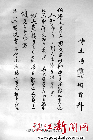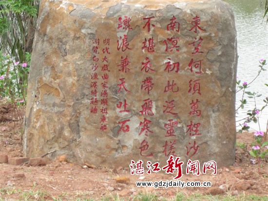 湛江新闻网讯:“东望何须万里沙,南溟初此泛灵槎;不堪衣带飞寒色,蹴浪兼天吐石花。”这是明代大戏剧家、诗人汤显祖在明万历十九年(1591)因上疏弹劾那些无行的辅臣科臣并语犯神宗,被以“假借国事,攻击元辅”的罪名贬为广东徐闻县典史,他游徐闻县白沙湾时留下的诗。白沙湾旅游区特用一个大石头把这首诗雕刻出来竖放在游览区的大门对面的公路上,给白沙湾增添一份够分量历史佐证。然而笔者在今年5月1日到白沙湾游览时,却看到雕刻着此诗的大石头上的该诗的最后一句从七律变为六字诗〔如图〕。笔者仔细看了一会儿,确定为人为破坏所致。这样现象在风景迷人、游人络绎不绝的风景区的出现显得十分不和谐,希有关部门给予该石雕上的诗词补救措施的同时加大对爱护公共财物的力度,让汤显祖的七律诗不再变为6字诗!