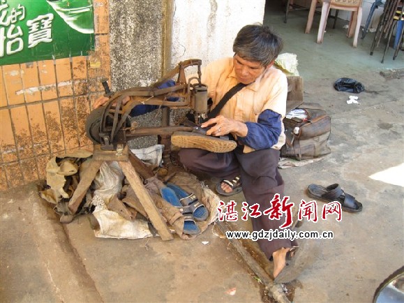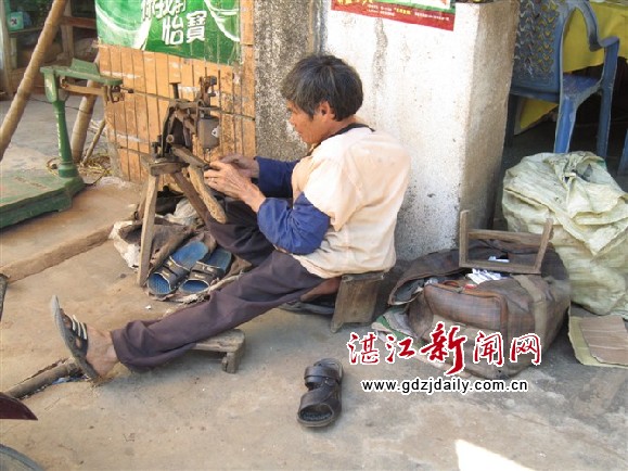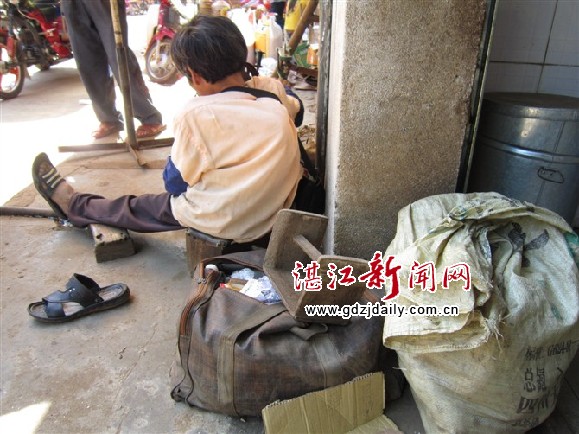 湛江新闻网讯:在徐闻县和安镇和安市场的大门口左侧的一间小食店的门口,有着一个在此块地方靠摆地摊给客人补鞋的残疾人,他日复一日,风雨不阻地演绎着他的补鞋人生。他叫李爸,今年57岁,系和安镇后湖村委会盐子村人,他三岁的时候因事故摔断双腿和腰部,尽管他的家人倾家荡产地为他寻医问药,但无济于事,他成为一个严重驼背靠用双手压着定型在90度弯曲的双腿的脚腕蹒跚行走的人。