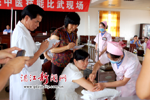 据了解,此次大比武,是徐闻县中医院以庆祝“5.12” 国际护士节为契机,组织开展的第二届中医理论“笔战”和技能比武活动。比武内容有中医基础知识简答、背默方剂、毫针、拔火罐等四项中医理论和中医护理现场操作技术,医护们平时得心应手的工作,在此次竞赛活动中被分解成若干个严格的考核内容,全面检验着选手们操作的准确性和熟练度。参赛的医护骨干共32名,并按名次予以奖励。通过技能比武,旨在鼓励和激发临床类别医师和护理人员学习中医的情趣,进一步提高中医医院中医服务的能力和水平。