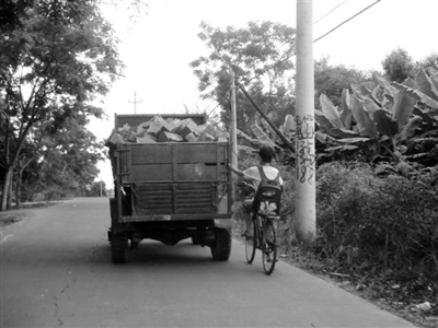 5月11日下午,记者经过徐闻县城北乡北水村时,刚好是北水小学放学时间。一名学生骑着一辆自行车往家赶的途中,竟一只手骑车一只手拉住前面一辆正在行驶中的满载石头的手扶拖拉机(如图)。该少年如此骑车行走了一段距离后,才在记者的劝说下放开抓住拖拉机车卡的手。在此希望同学们骑车上下学时,莫图方便、省力而不顾安全。