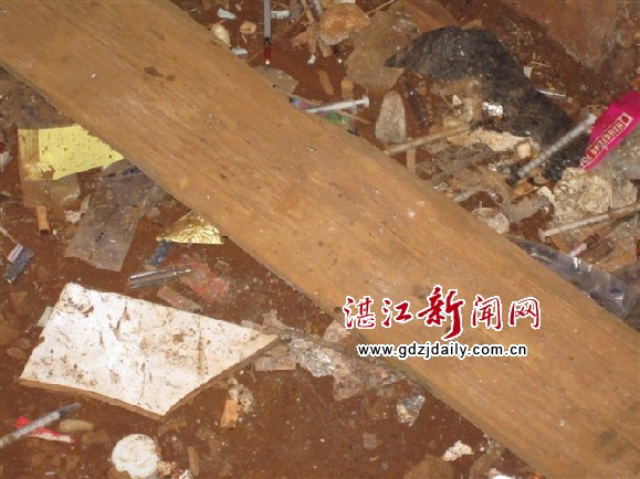 笔者开摩托车前往该屋的屋后时正巧碰见路面上有几个小朋友路过此屋,为了避免撞到小朋友,本人按了几次摩托车的喇叭,谁知突然从该屋中逃窜出了五个二、三十岁男人,他们头也不回地朝着各个巷子跑去。本人觉得十分纳闷,当本人背着相机走近该屋的门口时,看到该屋的每一房间里(该屋的房间都没有门的)都是注射过的针筒和烟头、溶化剂玻璃瓶等。细数其中的一个房间的针筒数竟然有100多支,有很多针头还沾着鲜血,我突然明白了刚才那五个男人逃窜的原因。