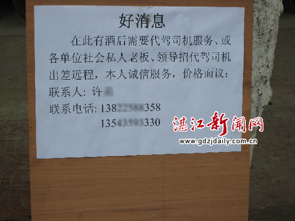 湛江新闻网讯:5月19日,笔者路过徐闻县城徐海路一电车店门口时看到一则“好消息”,某聪明商人充分利用国家推出“今年5月1日起,醉酒驾车将被追究刑事责任。”的机会,应运推出酒后代驾服务。据了解,代驾服务价格根据路程面议。