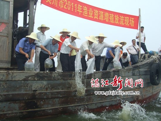 吴川市面江临海,江河纵横交错,水域辽阔。为了改善水域生态环境,放鱼虾一条生路,为捕捞渔业的可持续发展找一条出路,该市江河渔业资源增殖放流工作始于1988年,从2004年开始进行海洋渔业增殖放流工作。到目前为止,我市共增殖放流鱼虾苗约3950万尾,其中海水放流的种苗约1200万尾,放流的品种有斑节对虾、石斑鱼、鲻鱼、红友等。