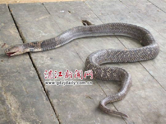 湛江新闻网讯:5月28夜9点35分,徐闻县和安中学一位姓林的女教师打开自己的住房大门开亮房灯时,看到在她的办公桌前有着一条眼镜蛇猛然昂头立身,膨大颈部发出“唿唿”声,作吐信子攻击状,吓得该女教师魂惊胆丧,魂销魄散的她撒腿就跑,慌忙中掏出手机向男同事求援,接到电话后,几个男同事拿来又长又大的木棍把这个夜半来客——眼镜蛇给予歼灭。