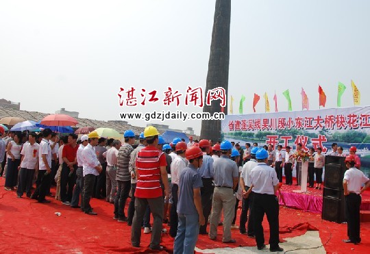 湛江新闻网讯:5月29日上午,小东江东岸吴川市梅菉永红社区窑地的市建材厂内彩旗招展,狮鼓喧天,该市重大基础设施工程项目、民心工程、总造价约1.1亿元的蓬吴线吴川段小东江大桥、袂花江大桥正式开工。两桥的动工建设,对于加快蓬吴线吴川段改造工程,完善该市城区交通网络,促进小东江、袂花江两岸片区的开发建设,提升吴川城市建设品位,促进吴川经济社会发展,具有明显而重要的意义。