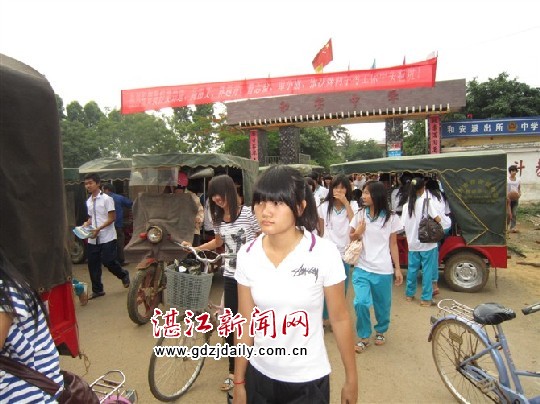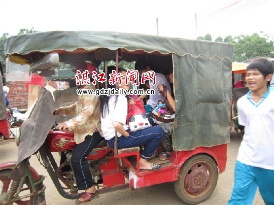 湛江新闻网讯:6月3日下午4:10分,笔者在徐闻县和安中学大门口看到整个学校门口前面30多米左右的范围内挤满拉客的非法营运三轮摩托车,使该校骑自行车或步行回家的学生要像穿梅花桩般才能行走出来。笔者看到一辆无牌三轮摩托车上竟然搭载着10个女学生摇摇晃晃地行驶,让人们看到都心惊肉跳!