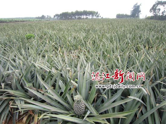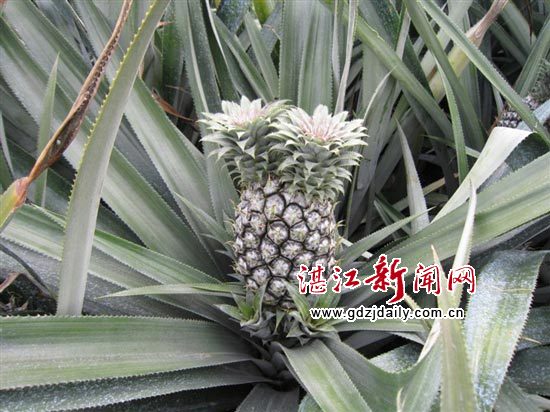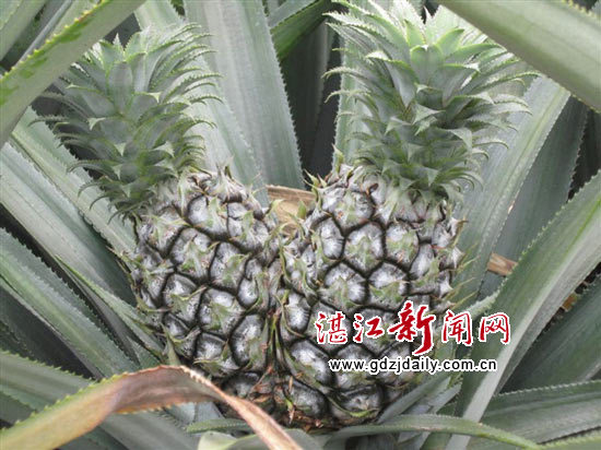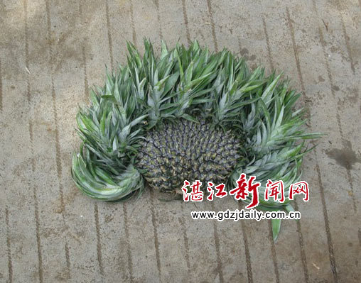 湛江新闻网讯:6月6日,笔者前往徐闻县曲界镇金满堂村找亲戚时,在该村的化肥经销店旁看到几十个村民正围一起对一个刚刚从菠萝园中摘下来品头论足。本人凑热闹也过去看了一会儿,原来该菠萝确实罕见。难怪种植一辈子菠萝的老百姓驻足观看!