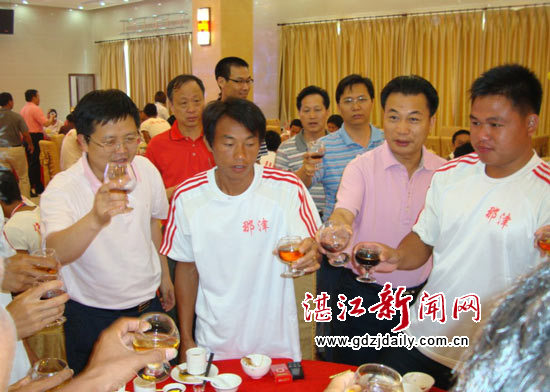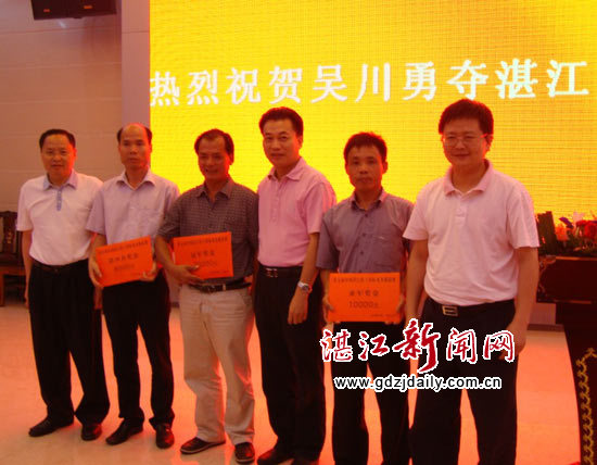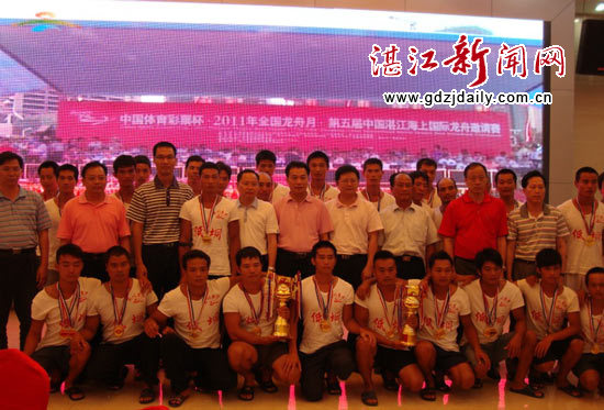 湛江新闻网讯:9日,吴川市举行龙舟庆功会,为获得“中国体育彩票杯”2011年全国龙舟月第五届中国湛江海上国际龙舟邀请赛湛江公开组及公开组总决赛前三名的伟信担保吴川黄坡低垌队和吴川驻深圳市海发公司龙舟队举杯庆功。吴川市委书记曹兴,市长江毅,市委常委、常务副市长姚华庚等出席庆功会。