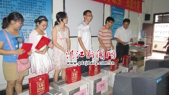 最后,来自吴川市广播电视台的吴东梅以95的高分一举夺魁,荣获一等奖;吴川市自来水公司的王烨94.5分、樟铺镇政府的李杰华94.3分、吴川市广播电视台的曾庆玲94分、吴川市第四中学的麦小艳89.7分、吴川供电局的麦颖丹89.5分同获二等奖;市委办王俊等五位同志获得三等奖。吴川市委常委招励、吴川市信息网络管理办公室主任姚学沼为获奖选手颁奖并合影留念。