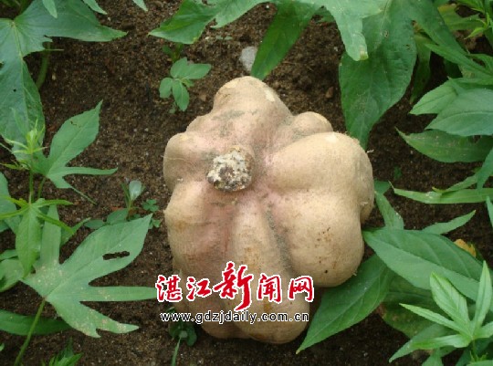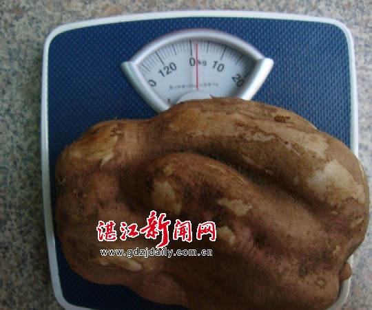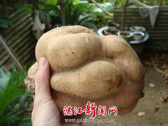 湛江新闻网讯:日前,吴川新地村的村民向笔者报料称,他家的田地种出了一只形态奇怪的大番薯。