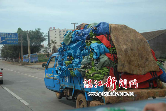 湛江新闻网讯:凡是前往徐闻采风,总是一路风光看不尽,满街风情尽情领略,仅道路街道里穿梭来往的外地的或本地的鲜绿果蔬货车就是一道风景。其中让人感觉新奇印象尤深的是小货车或三轮车上拉的香蕉,每梭都裹上毯子,舒舒服服地躺在车上,被车从香蕉园拉回集贸市场或加工装车点。