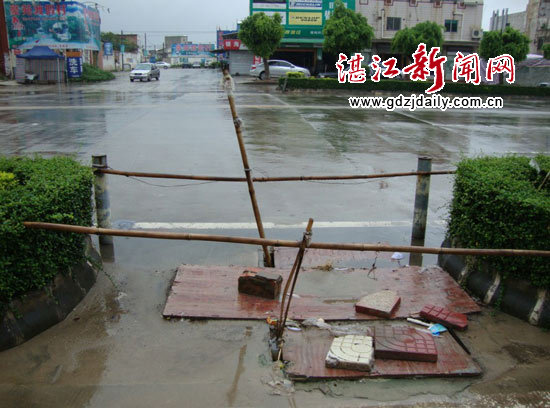 在市中心市场的国道325线旁,一个沙井口赫然出现在眼前,沙井口上还插着树木来警示行人车辆,笔者走进一瞧,该沙井深约2米左右,井内较宽,如果真掉了下去,还真难爬上来。在离该沙井不远的地方,同样的也有一个没盖的沙井。同一路段就有两个沙井盖被盗,行人车辆真的要很留心了。