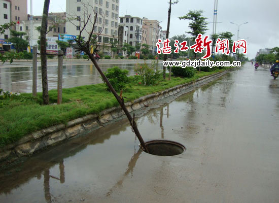 而在海港大道的绿化带出口处,笔者又发现了另外一个沙井盖也被盗,值得庆幸的是,好心的市民找来的木板和竹竿把该沙井围了起来。