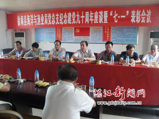 湛江新闻网讯:6月28日下午,徐闻县海洋与渔业局党总支部在该局七楼会议室召开庆祝建党九十周年座谈暨“七•一”表彰会议。参加会议的有徐闻县直工委黎木保副书记,以及该局党总支53名党员,会议由该局党总支委、机关支部书记黄剑飞主持。