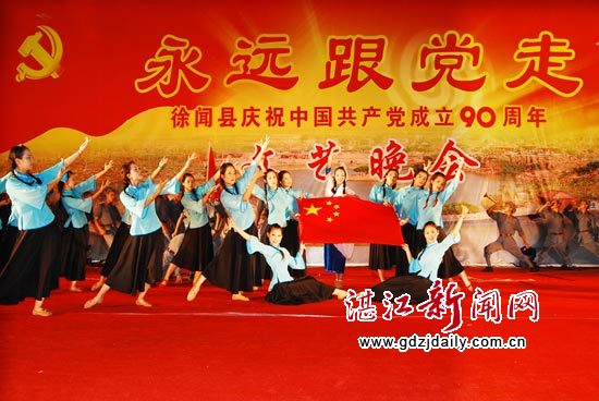 湛江新闻网讯:6月29日晚上8时正,由中共徐闻县委宣传部、组织部主办的徐闻县庆祝中国共产党成立90周年《永远跟党走》主题文艺晚会在该县文化广场隆重举行,该县四套班子成员与当地群众欢聚一堂,载歌载舞,共同庆祝中国共产党成立90周年走过的光辉历程。