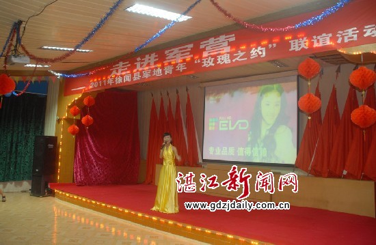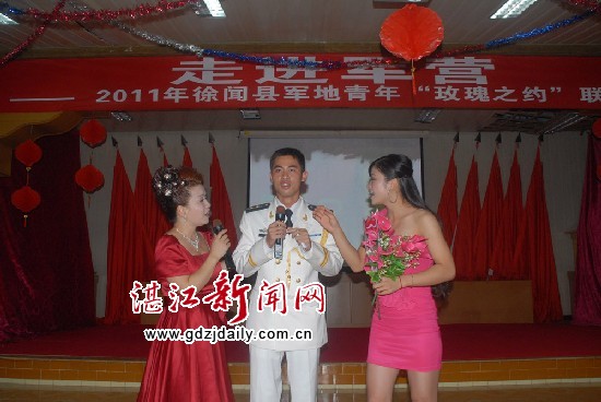 湛江新闻网讯:千里姻缘一线牵。7月15日,徐闻县委宣传部、驻徐大井部队、团徐闻县委在驻徐大井部队共同举办军地青年“玫瑰之约”联谊活动,安排参观军营、共进晚餐、联谊活动等节目。来自徐闻县电台、保健医院、第二人民医院等单位的女青年和驻徐大井部队未婚军官共50名共赴此次“玫瑰之约”。让他们相约鹊桥,寻找心中的最爱。徐闻县委常委、宣传部部长戴吴金荣、团县委副书记曾祥浩、驻徐大井部队领导等出席联谊活动。