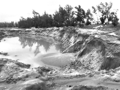 近日,吴川市塘尾街道边坡村委会邱屋村部分村民向记者诉说。记者实地调查时看到,白沙岗的沙依然又白又细,不过,这个沙岗已是“千疮百孔”、名不副实了,遭采砂被挖成的多个深坑,面积达数十亩之多。