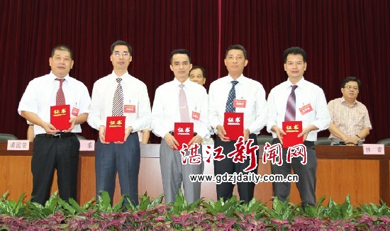 徐闻县领导侯德耀、李乐、林青、谭国荣为农工党徐闻总支主委金呈祥、副主委方漫、麦家铭、委员陈诚玮、郑祥野颁发当选证书