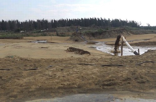 7月21日上午9时,吴川市吴阳镇姚村。距离海边两三百米的一个路口旁,几台机器矗立在沙地里,发出阵阵轰鸣。10米外的管道口正喷出红褐色污水。旁边沙堆里的一块石碑上,“推行封山育林,建设生态农业”几个醒目大字,在阳光照射下显得格外刺眼。