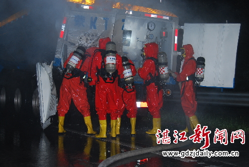 (记者罗磊 陈彦 通讯员揭宗霖摄影报道)今日凌晨2点21分,湛江消防指挥中心接到市公安局传来警情称:茂湛高速往湛江方向离官渡服务区4公里路段处(塘缀<与“缀”同音>进高速往湛江方向2.5公里处),一辆拖头车追尾一辆液化天然气槽罐车(装有二十吨液化天然气),导致天然气槽罐车发生气体泄漏。