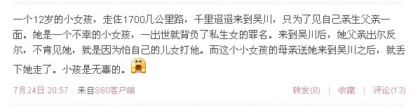 湛江新闻网讯:网友“静静滴--XL”24日在微博中说,一个12岁的小女孩,走了1700几公里路,千里迢迢来到吴川,只为了见自己亲生父亲一面。她是一个不幸的小女孩,一出世就背负了私生女的罪名。来到吴川后,她父亲出尔反尔,不肯见她,就是因为怕自己的儿女打他。而这个小女孩的母亲送她来到吴川之后,就丢下她走了。小孩是无辜的。