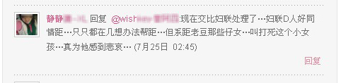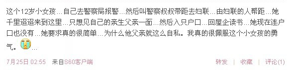 25日02:55,网友“静静滴--XL”再次发微博说,这个12岁小女孩自己去警察局报警,然后叫警察叔叔带她去妇联,由妇联的人帮她。她千里迢迢来到这里,只想见自己的亲生父亲一面,然后入个户口,回家读书。她现在连户口也没有,她要求真的很简单,为什么他父亲就这么自私。我真的很佩服这个小女孩的勇气。