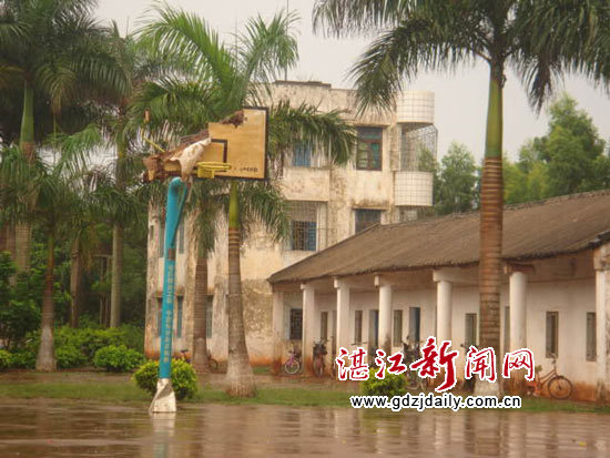 湛江新闻网讯:记者近日到徐闻县下桥镇北插小学采访时,发现该校篮球场南边那个篮球架非常特别:蓝色的铁制支架和黄色的投篮筐完好无损,但投篮板的二分之一已经烂掉。原本是四方形的投篮板,已经变成了一个近似三角形。记者从该校一位老师那里了解到,该篮球板破损成目前这个“美丽”样子已经有半年多时间了,但学校仍然没有把它换掉而留着继续使用。