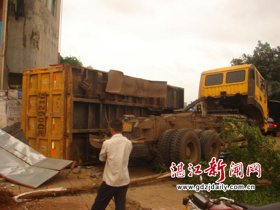湛江新闻网讯:8月10日下午,一辆运载建筑石料的泥头车在徐闻县城北乡207国道上因爆胎失控后冲向人群,万幸的是群众及时避开而没有造成人员伤亡。