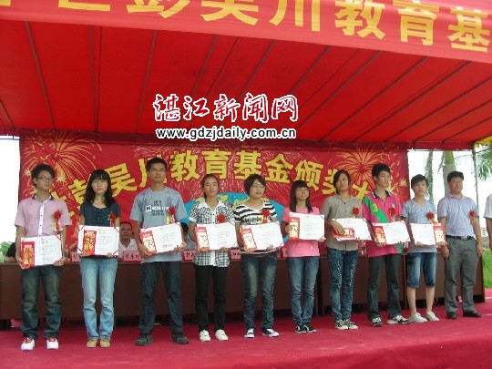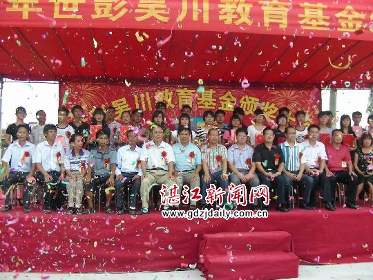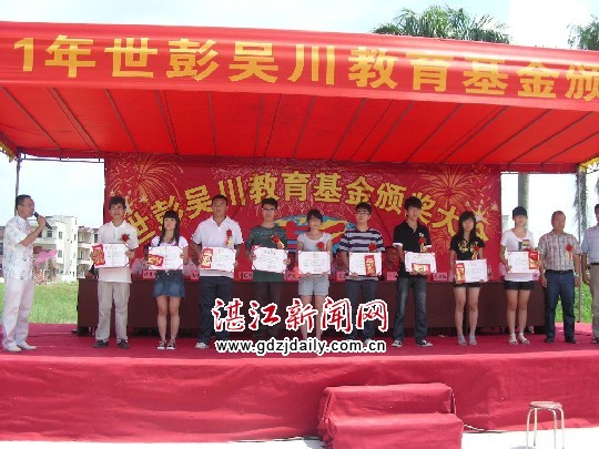 湛江新闻网讯:23日,世界彭氏教育基金会广东吴川分会在振文镇沙美村委会华坡村举行2011年彭氏教育基金颁奖大会,今年高考被本科大学录取的26名吴川籍彭姓子女和1名入选国家少年足球队的彭姓子弟喜领奖学金。
