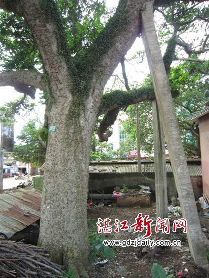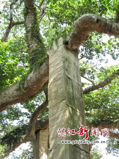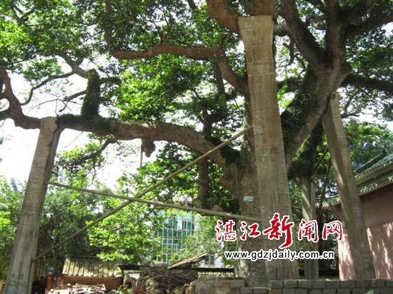 湛江新闻网讯:在徐闻县曲界镇爱民街的关帝庙的后面,有着一棵130多年树龄的参天大树——猎朗树,该树高度大约有27米,树干需三个成人手接手才能完全拥抱。整棵树绿荫覆盖面积有 2000多平方米,由于该树常年绿叶茂密,树上的枝干不堪忍受重压,有几根枝干被压得往地面方向下垂,为了避免偶尔从这里开过的货车把这棵树的枝干刮断,给古树带来伤害。2009年5月份经过多次附近的市民探讨研究后,决定让市民自发捐款使用钢筋混凝土柱来托顶已经下垂的枝干,捐款数额自己决定,在短短的一个星期时间内就筹得资金7万多元,在不到半个月时间就在该树的底下多加了四根高低不一的钢筋混凝土支撑保护柱,据了解,这样的古树保护支撑柱是湛江地区最牛的支撑保护柱!