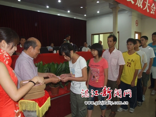 湛江新闻网讯:8月30日,吴川市委组织部、关工委召开关心下一代“关爱工程”2011年资助金发放大会,加拿大侨民、香港新业国际股份有限公司董事长梁锦棠先生慷慨解囊,独家捐资,为该市今年考上2A以上的116名城乡贫困大学新生每人送上资助金2000元,共发放资助金23.2万元。曹兴、陈卜红、陈文海、陈政等市领导出席大会。