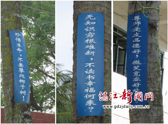 谁人都知道,德育是对学生进行思想、政治、道德、法律和心理健康的教育,是学校教育工作的重要组成部分,与智育、体育、美育等相互联系,彼此渗透,密切协调,对学生的健康成长成才和学校工作具有重要的导向动力和保证作用。徐闻县一中学为了让学生随时能看到和记得日常生活中“人生训条”又巧妙把利用该校校道上的绿椰成荫的椰子树来另外悬挂上告诫式或者温情式的日常生活标语。 来自贫困家庭的学生小李说:“每次他看到‘家长养育辛苦,报恩唯有苦读’这则标语都能使他心灵有所触动,他说,父母亲为了让他们姐弟上学,每天日出而作,天黑而归地耕种着那一片片红土地,假如我不好好学习,实在对不起父母了! ”